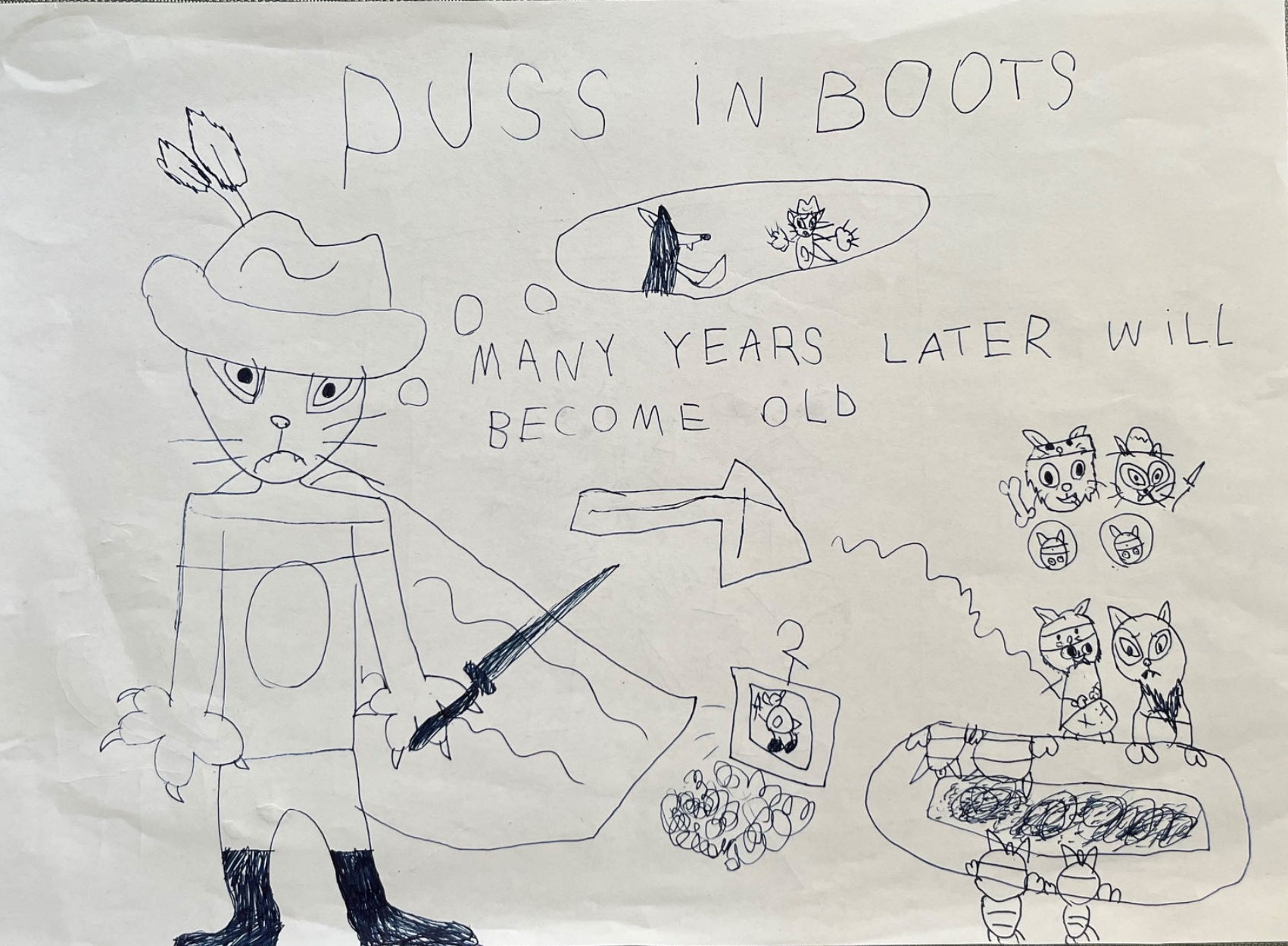 And still, the liberal tradition, illuminated by the ideals of the Enlightenment, does offer more space for a postmodern conceptualization of daring as an incentive towards citizen advancement in the direction of moral autonomy. To illustrate this opening of the liberal state for offering more visibility to its citizens’ daring to scrutinize the moral character of political life and institutions, I will use a world-famous catchphrase, or more precisely a “catphrase”: Fear me, if you dare! I have had the opportunity to reflect on these words of wisdom while being invited by my six-year-old daughter to watch with her, over and over, one of her favorite computer-animated movies, Puss in Boots: the Last Wish (the image of this essay being one of my daughter’s drawings at the time she watched this movie in cinema). After all, who may be better advised to characterize the postmodern political attitude of the liberal state, if not Puss in Boots, that furry outcast, the hero, the inspiration for children’s own imaginative prospecting into self-disciplining, and the legend that will never di—?