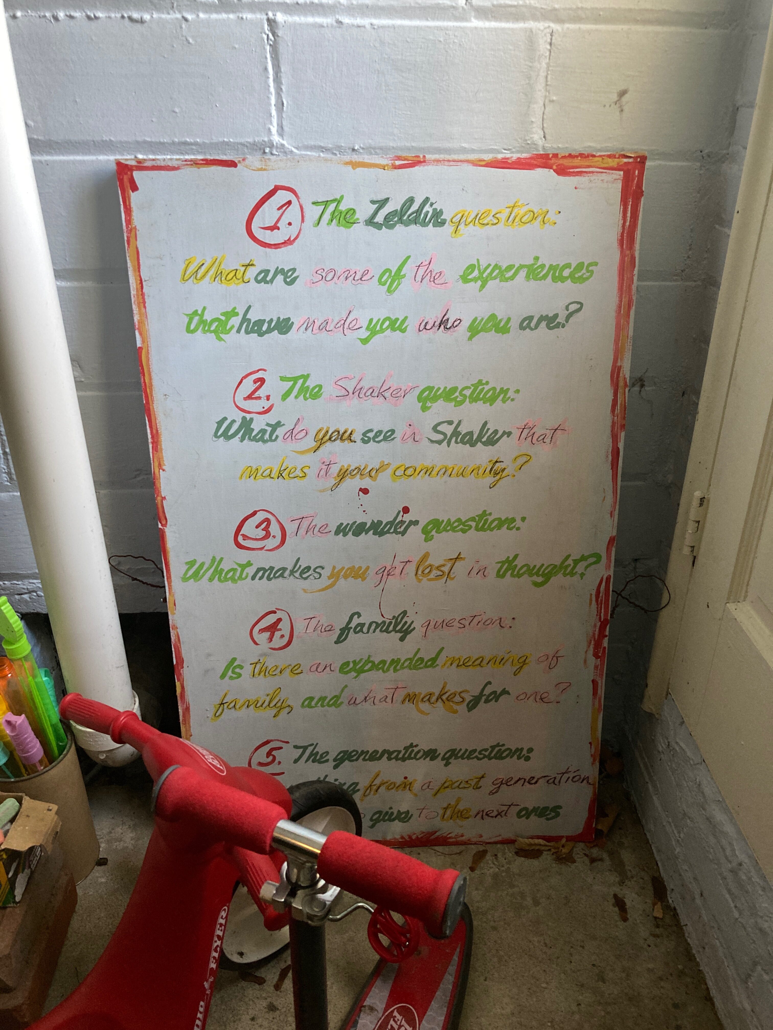 Talking things over in Misty’s studio one night after the kids went to bed, Misty and I created five questions as a basis for discussion among neighbors. Our inspiration came from Theodore Zeldin’s Oxford Muse discussion dinners of the 2000s. I had worked with Zeldin in the mid-2000s on portraits from the United Arab Emirates (they are astonishingly deep!). So, the first question was named after him, “the Zeldin Question.”