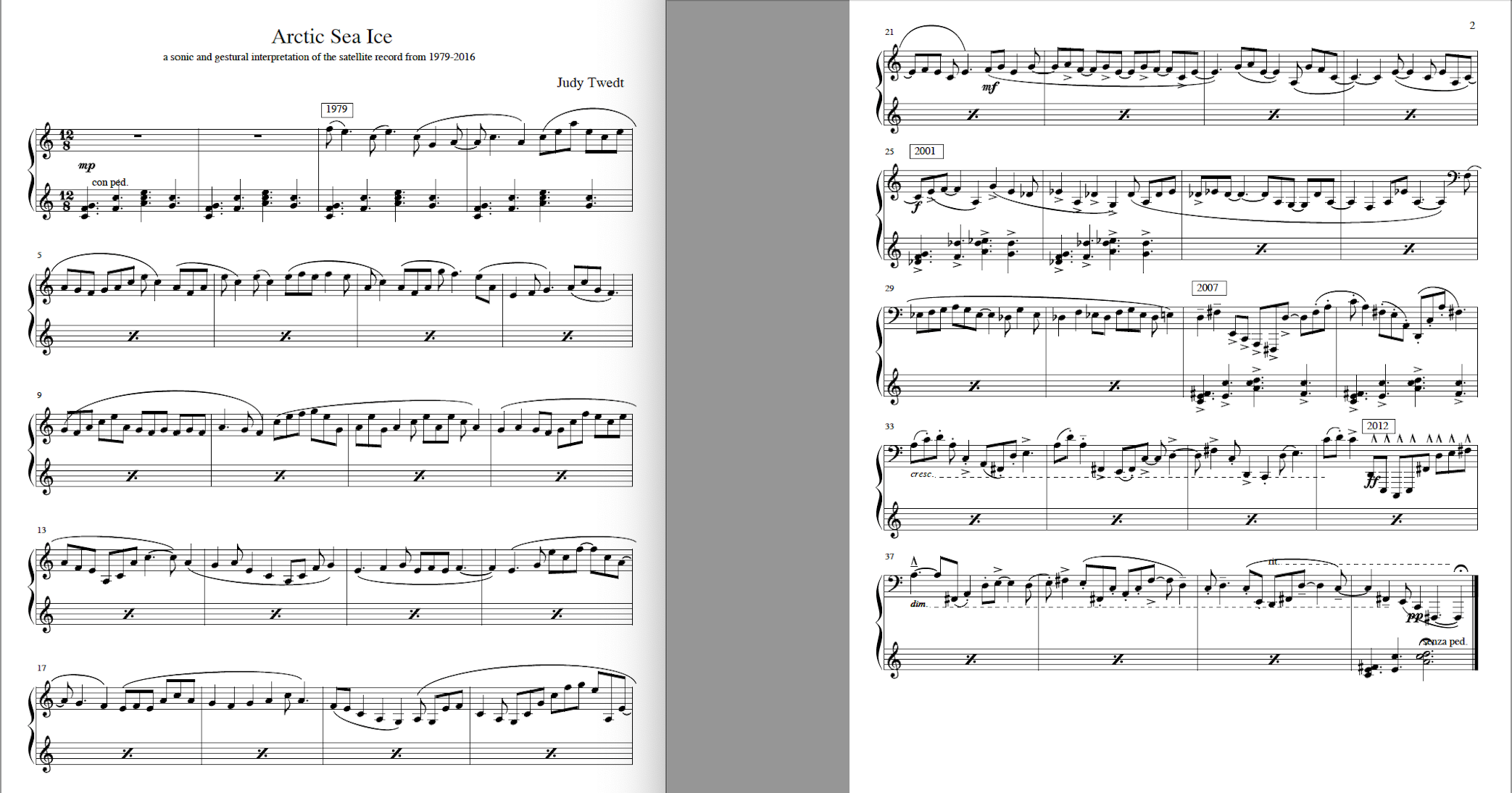 The piece begins with the left hand playing two measures of the seasonal chords before the right hand joins in playing the monthly sea ice anomalies. This allows the listeners to hear the rhythmic sound and pace of the seasons alone, before adding in the additional layer—the sea ice values—from the right hand. The music starts with data from January 1979 and ends in August of 2016—the end of the summer melt season. This video captures a performance by Jason Hardink, principal pianist for the Utah Symphony, in a recording with the University of Utah’s artivism4earth festival.