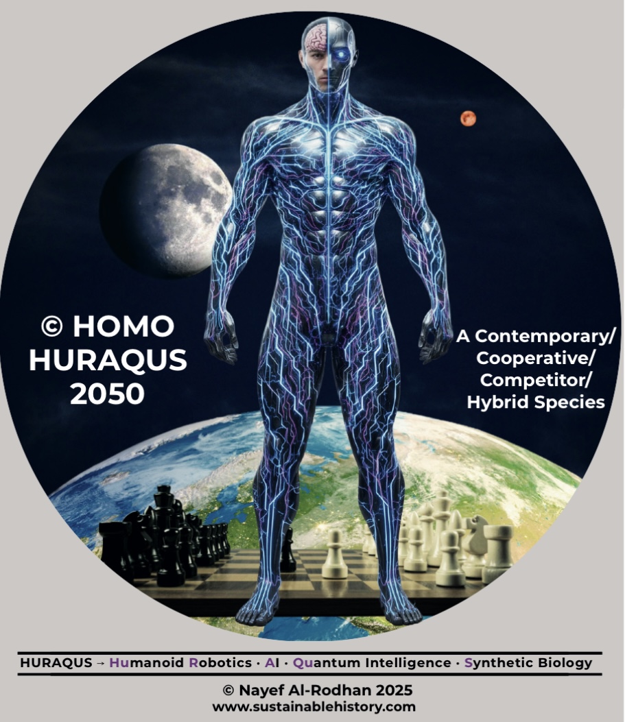 At this civilizational frontier appears Homo HURAQUS 2050, a hybrid or enhanced entity imagined around 2050 as a possible contemporary competitor and/or collaborator, a likely rival to Homo sapiens. The acronym HURAQUS denotes its basis in HUmanoid-Robotics, AI-superintelligence, QUantum intelligence, and Synthetic biology. Framed as a potential strategic horizon rather than science fiction, Homo HURAQUS 2050 illustrates both the exponentially expanding technological agency we wield and the challenging implications of reshaping humanity.